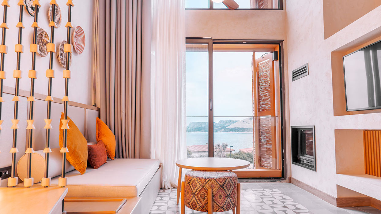 Akdeniz mimarisinden ilham alan odanın yumuşak dokunuşları ve minimalist tasarımlarını Loft Suitelerimiz ile keşfedin.